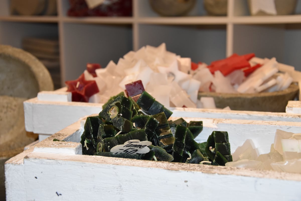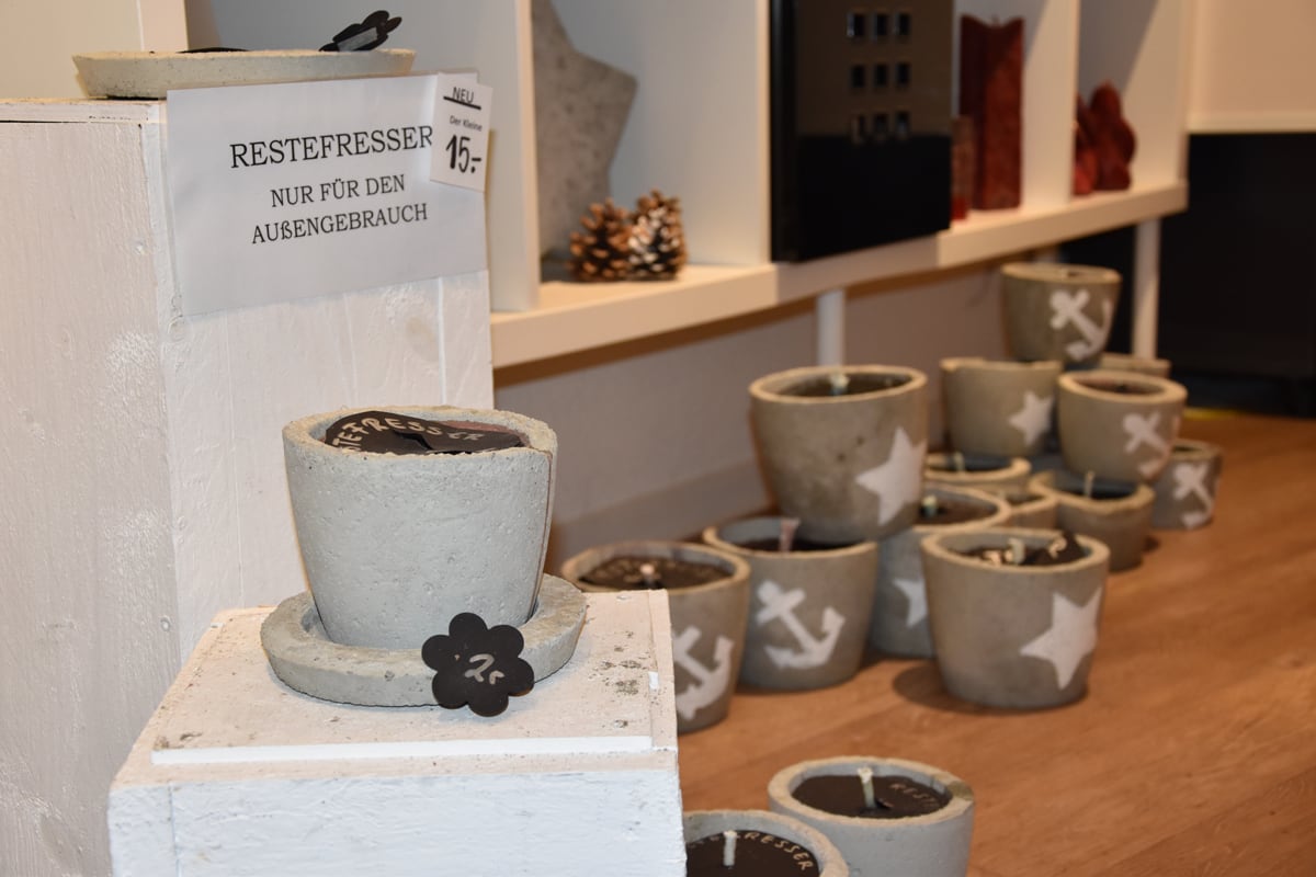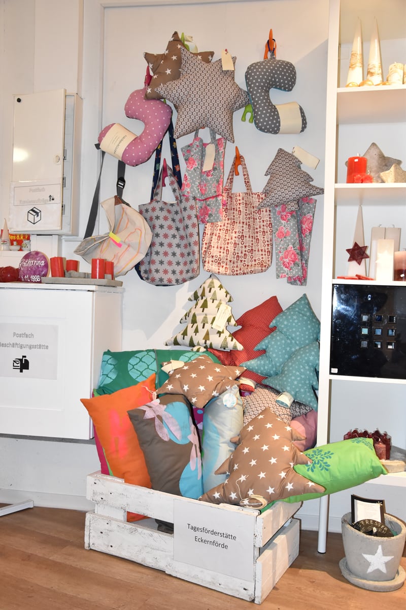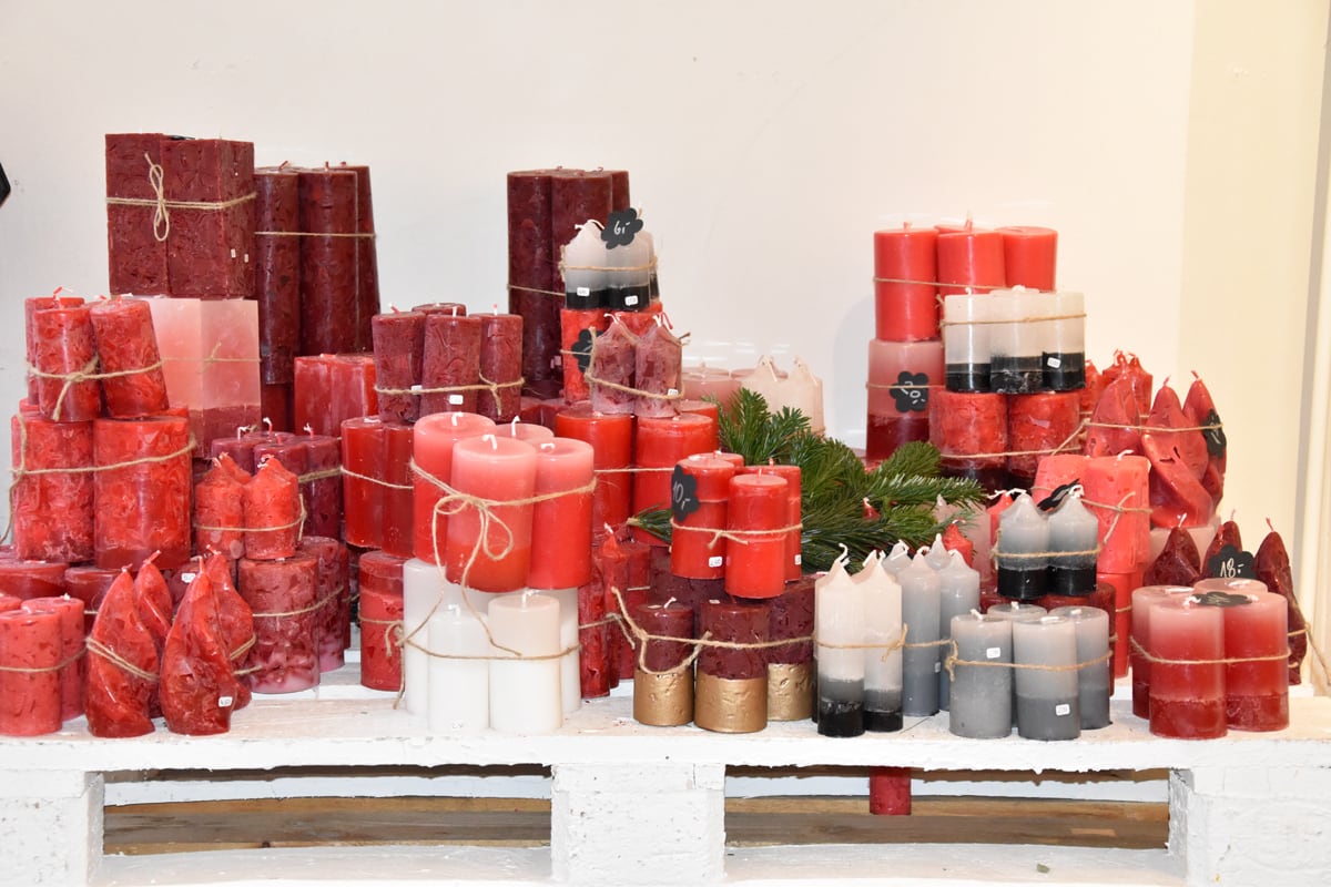 Menschen mit Handicap stellen kunstvolle Kerzen her und verkaufen diese vor Ort. Daneben werden wechselnde Produkte aus allen Arbeitsangeboten der Arbeits- und Bildungsorte Schleswig und der Tagesförderstätte Eckernförde der Hesterberg & Stadtfeld gGmbH angeboten.